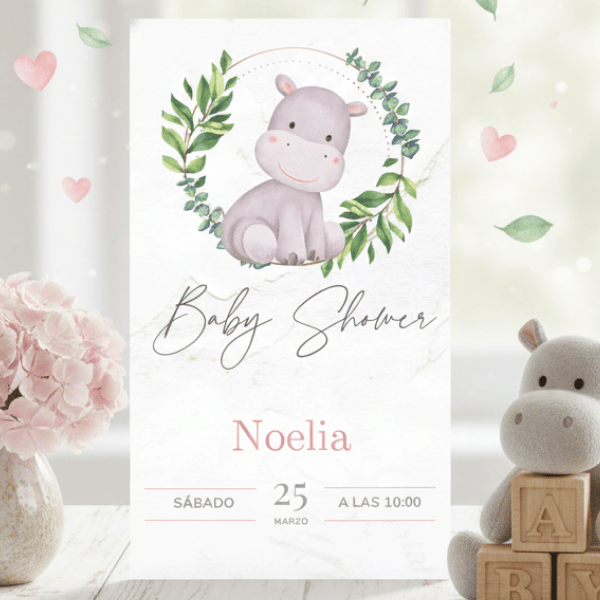 ¡Celebra la llegada del nuevo miembro de la familia con nuestra dulce y tierna invitación de Baby Shower con hipopótamo rosa! ¡No te pierdas la oportunidad de hacer que tu Baby Shower sea inolvidable!